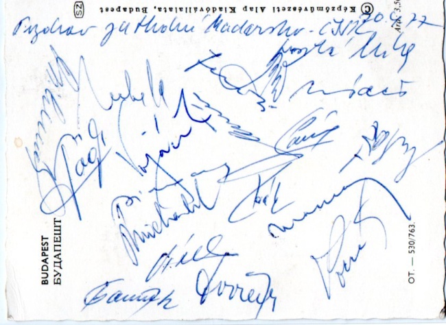 autogramy: Zdenšk Nehoda, Ján Kozák, Marian Masný, Koloman Gögh, Jaroslav Pollák, Ladislav Vízek, Jozef Móder,