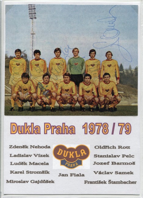 Dukla Praha 1978/79 autogramy: Zdeněk Nehoda, Ladislav Vízek, Luděk Macela, Karel Stromšík, Miroslav Gajdůšek, Oldřich Rott, Stanislav Pelc, Jan Fiala, Václav Samek, František Štambacher |