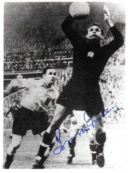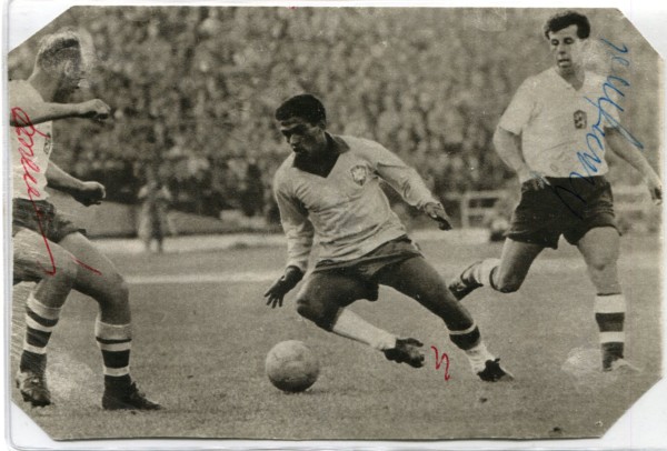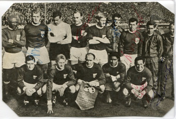 oboustranný snímek z dobového magazínu (1963 Anglie vs. výběr světa) - podpisy: